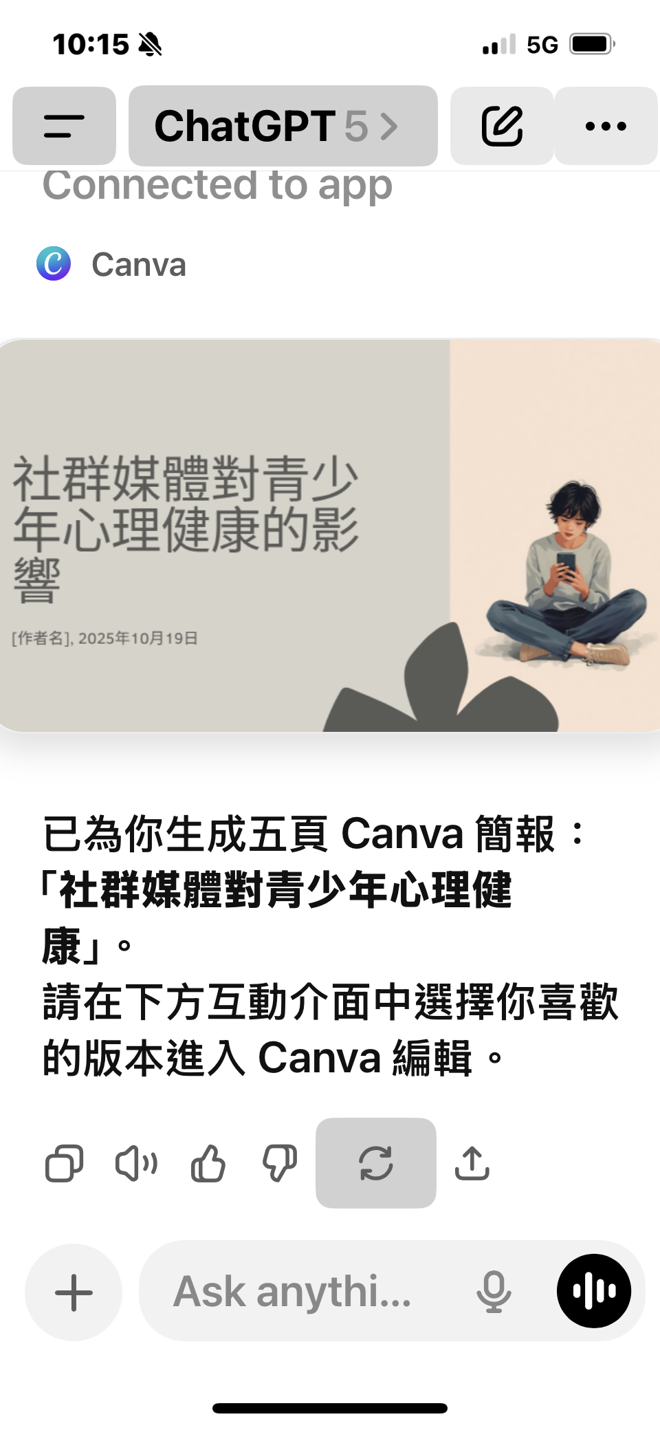 39. With Canvas launched in ChatGPT, is Claude Pro still worth it? : r/ClaudeAI - Reddit 30. Critical Thinking in the Age of AI: A Systematic Review of AI's Effects 42. AI in Schools: Pros and Cons - College of Education | Illinois 38. Human-AI Co-Creativity: Exploring Synergies Across Levels of Creative Collaboration用 ChatGPT → Canva 快速做出 5 頁 [主題] 的簡報
